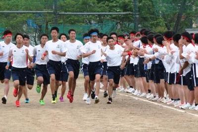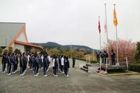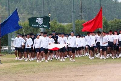 各部代表の決意表明や、選手宣誓、教頭先生からの激励の言葉のあと、選手たちを囲むように生徒や職員で円陣を組み、校歌斉唱や在校生エールを行いました。