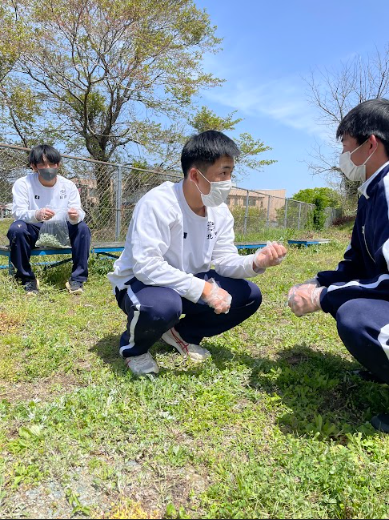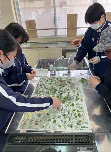 新年度がスタートし、小国にも春がやってきました。朝の気温は8℃くらいでまだ寒いですが、昼間は20℃を超えて夏日です。コロナ禍を終えて今年度は、今までより自由に調理実習ができそうです。春の草花たちが一斉に芽を出していたので、よもぎ摘みを行いました。調理室で、より分けて、茹でた後冷凍しました。来週よもぎもちを作ります♪