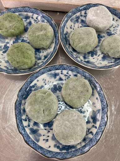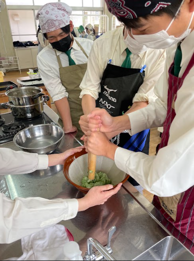 先週収穫したよもぎを解凍して、よもぎもちを作りました。すり鉢とすりこ木を使って餅をつく要領で、ひとまとめにする作業が力仕事です!男子が全力でついたお餅は、いい仕上がりで、よもぎの風味と色合いを感じながらおいしくいただきました!