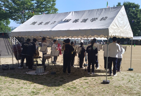 熊本県立小国支援学校で実施された「すぎのこ運動会」に、本校吹奏楽部の生徒がボランティアとして参加しました。開閉会式で行進曲や国歌を演奏しました。全校リレーにボランティアチームとして参加するなど、小国支援学校の皆さんと交流する良い機会になりました。