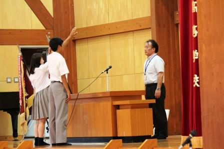 明日からの高校総体・総文祭を前に、出場する選手の推戴式が行われました。昨年度は熊本地震の影響で、総合開会式が行われませんでした。2年ぶりの開会式、胸を張って堂々と行進してきてください。また、3年生にとっては3年間の集大成です。悔いが残らないよう、頑張ってほしいと思います。出場する種目と会場は以下の通りです。