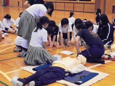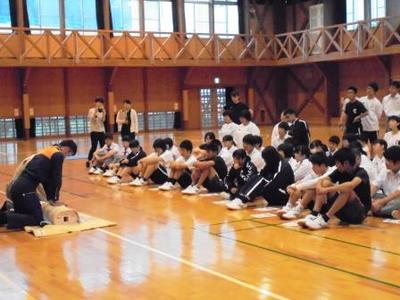 小国高校では全生徒・全職員を対象にAED講習会を年に1度実施しています。この日は1年生でした。初めてAEDを触ったり、心臓マッサージ・人工呼吸を体験した生徒がほとんどでした。消防署の職員の方の話を真剣に聞いて取り組んでいました。