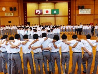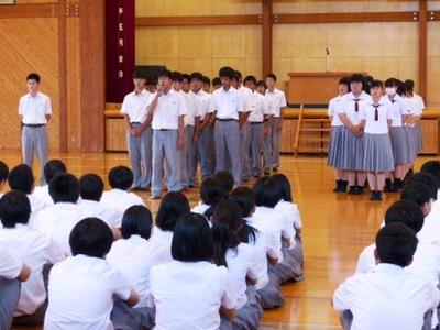 各部代表の決意表明や、選手宣誓、教頭先生からの激励の言葉のあと、選手たちを囲むように生徒や職員で円陣を組み、校歌斉唱や在校生エールを行いました。