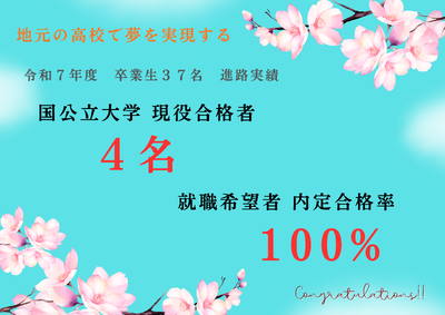 卒業生の進路実績はこちらです。以下のボタンをクリックして下さい。 R7年度卒業生進路実績 R6年度卒業生進路実績 R5年度卒業生進路実績 R4年度卒業生進路実績 R3年度卒業生進路実績 R2年度卒業生進路実績 R1年度卒業生進路実績 H30年度卒業生進路実績 H29年度卒業生進路実績 H28年度卒業生進路実績 H27年度卒業生進路実績 H26年度卒業生進路実績 H25年度卒業生進路実績 H24年度卒業生進路実績