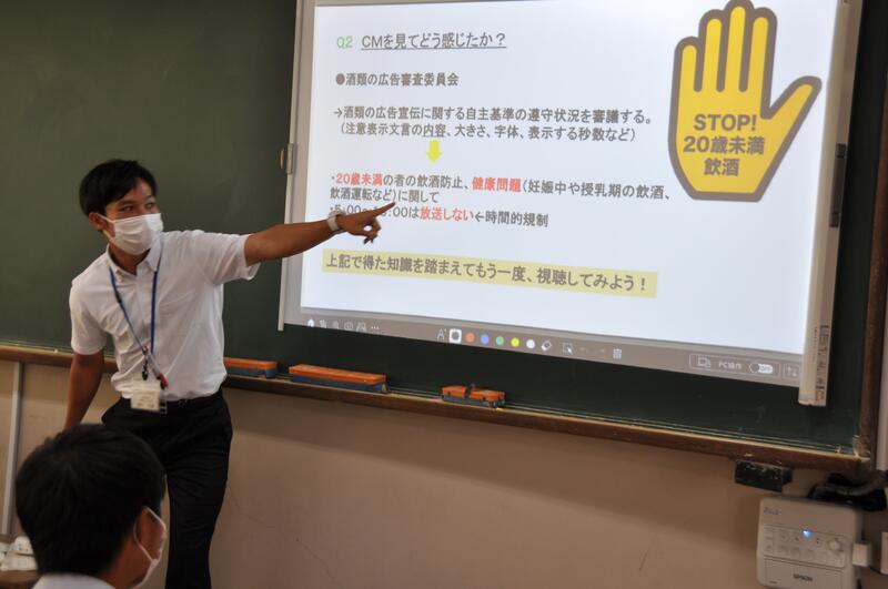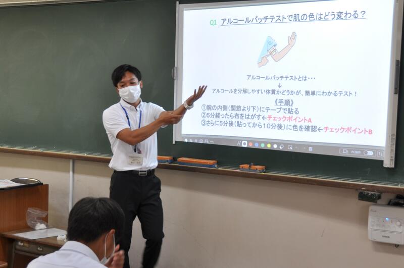現在、教育実習生が1名3週間の実習を行っています。本日2限目1年生の保健の授業で研究授業を実施しました。多くの先生方の見守る中、「飲酒と健康」をテーマに授業がありました。