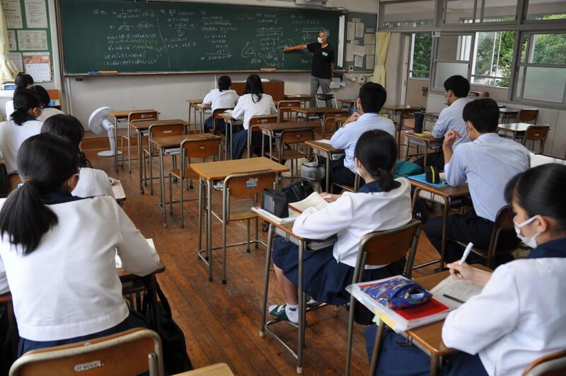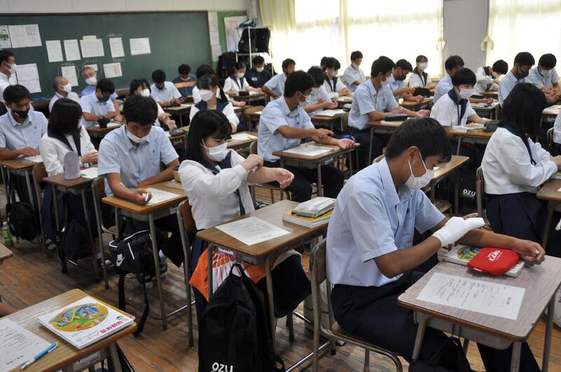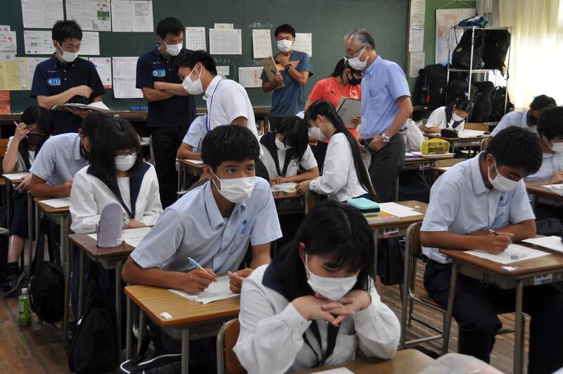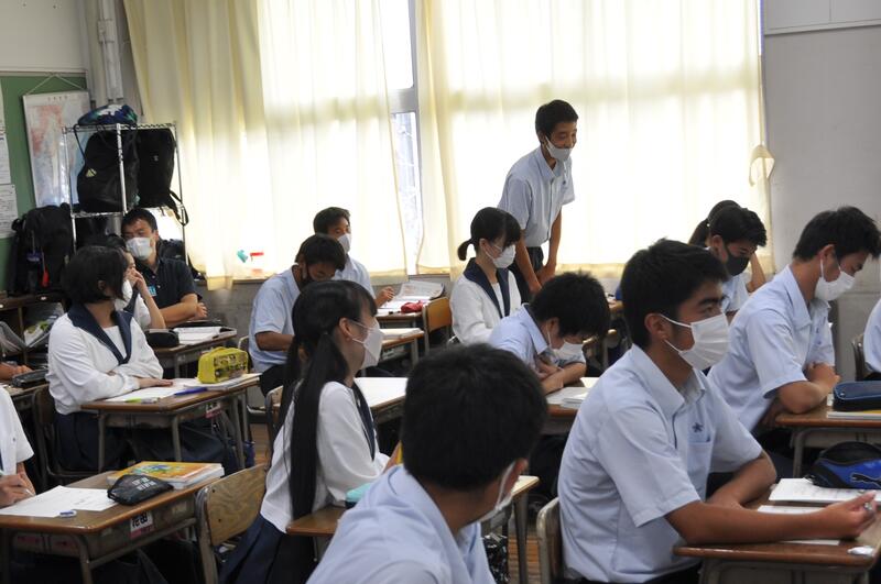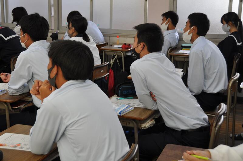 本校は、新型コロナウイルス感染症防止に伴う対応として、3年生は通常登校、1,2年生は時差登校を行っています。校内での感染防止の取り組みは、手指消毒、換気、マスク着用などの徹底を引き続き行っています。