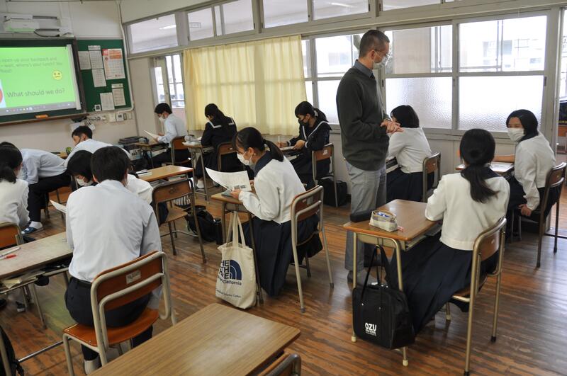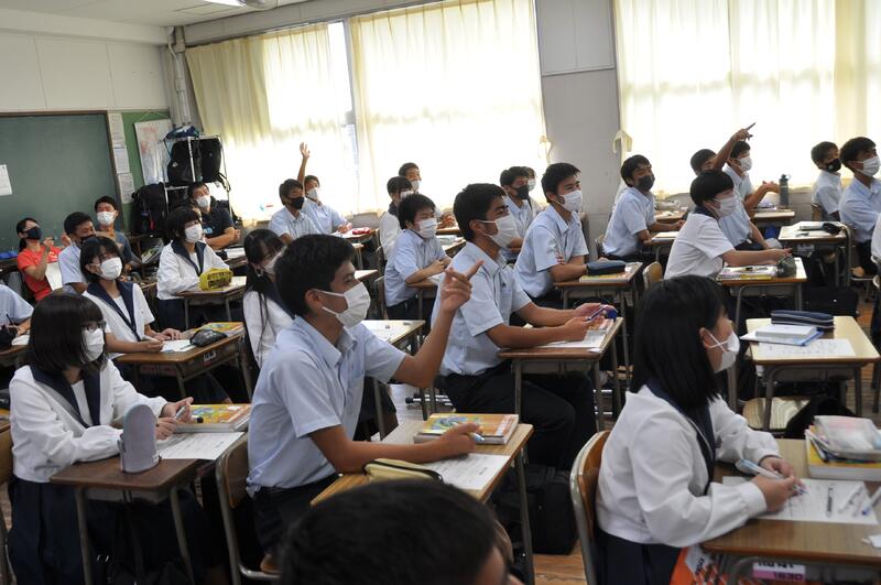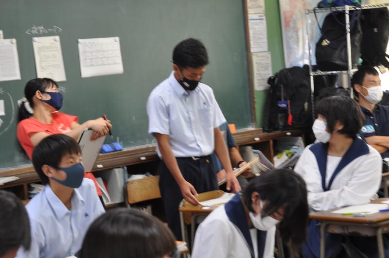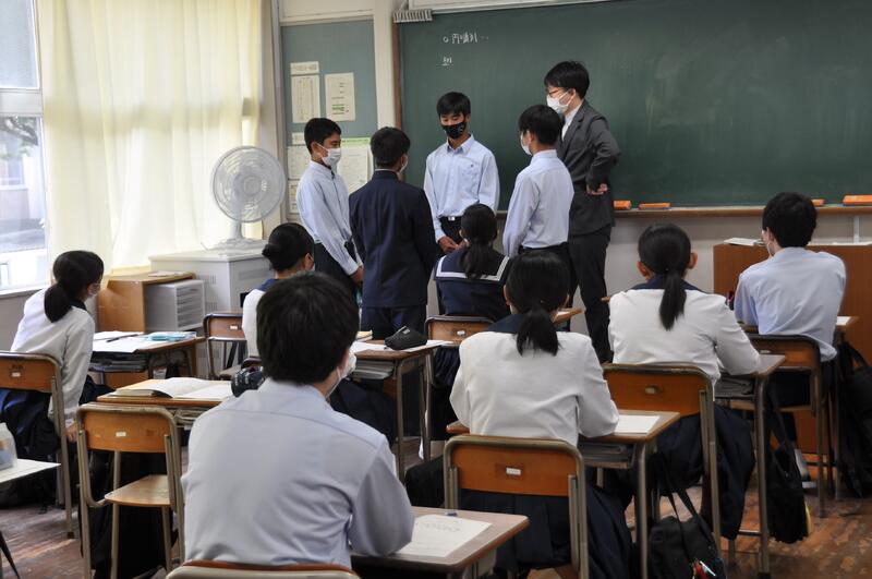 本日午後、熊本県教育委員会義務教育課から来校され、英語科の公開授業を参観されました。ホームページでは1年生の1組と6組のコミュニケーション英語の授業の様子を紹介します。また、1年生の数学では円順列の授業が行われていました。
