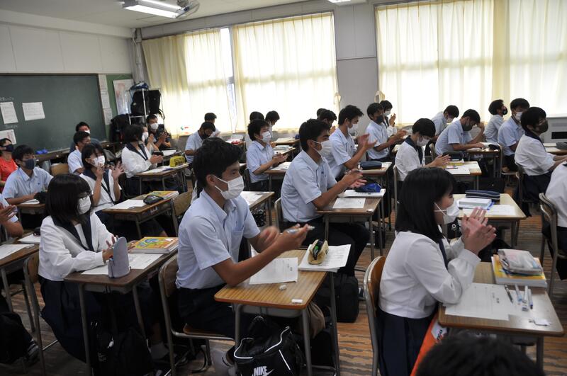 本校では毎年2学期開始時期に、本校の教育目標である「恕のこころ(思いやりの心)」について、あらためて理解を深め、いじめのない安全・安心な学校づくりを目指し、「恕のこころウィーク」を実施しています。本日5限目は、講師に深迫祐一さん、祥子さんご夫婦においでいただき、「今、大切な人を亡くしたら」を演題に1,2年生に対して、講演をしていただきました。視聴覚室から各教室へ講演をLIVE配信しました。