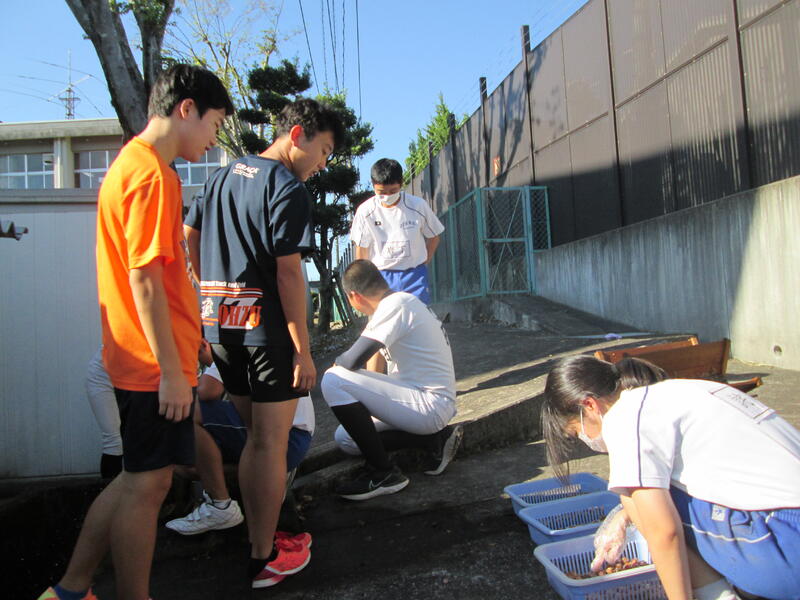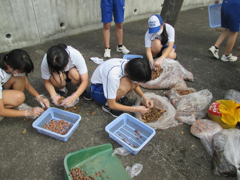 銀杏について事前アンケートを取ったところ、ぎんなんのことやかぶれることを知らない生徒が多かったので、まずは家庭クラブ員が銀杏について説明をしました。その後、クラスで校内の銀杏集めの活動を行いました。かぶれないようにビニール手袋は必須アイテムです。