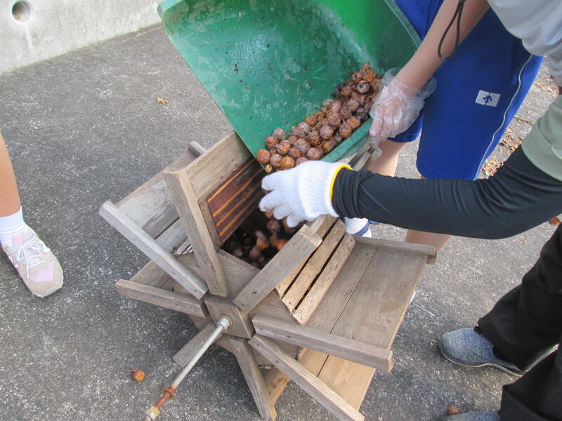 1学年家庭クラブ活動で取った銀杏を、水車で洗いました。