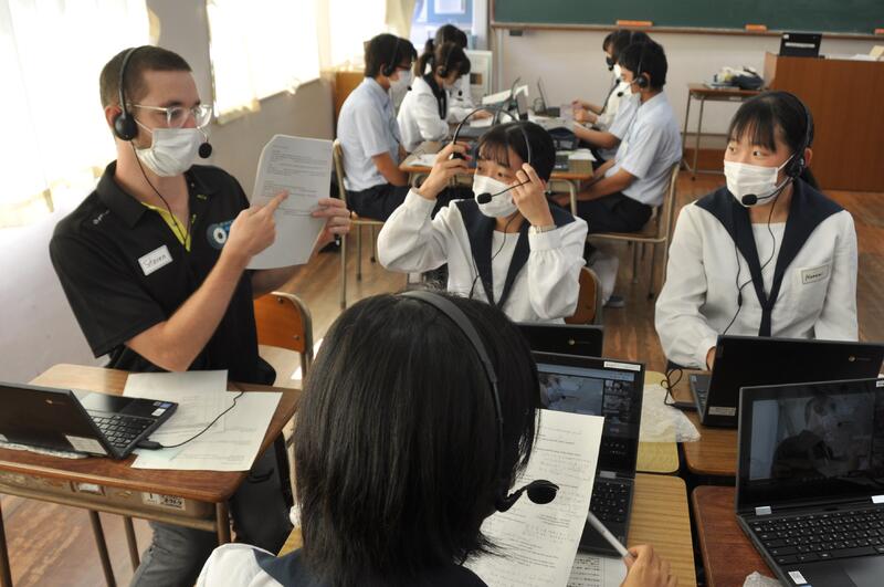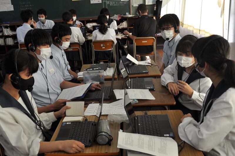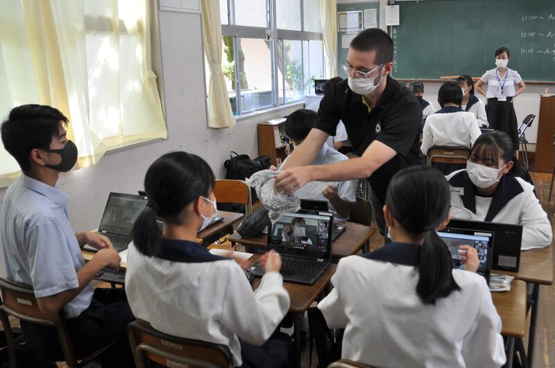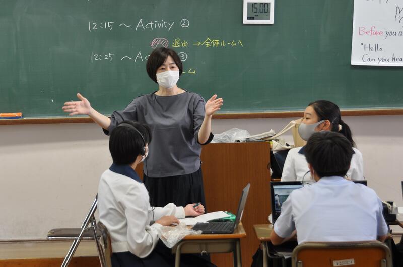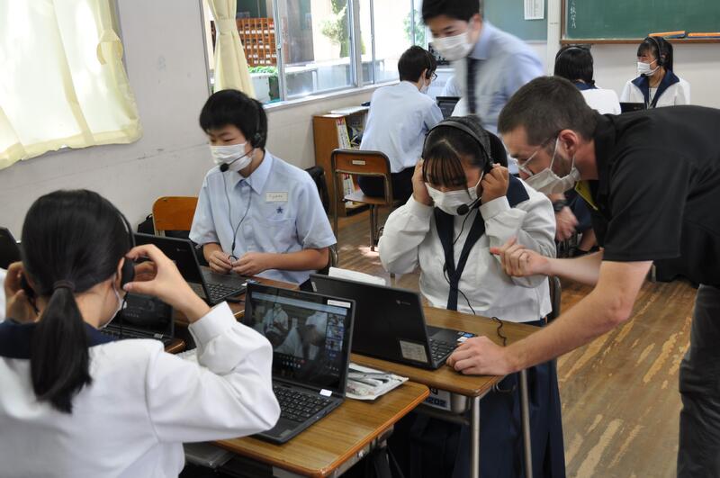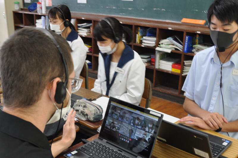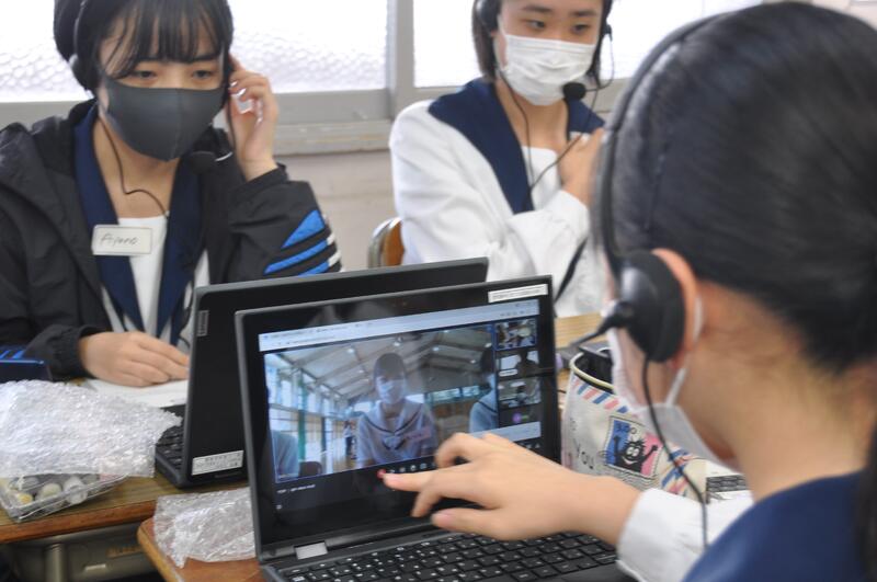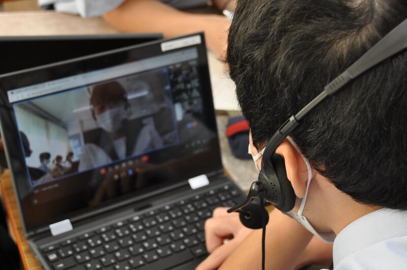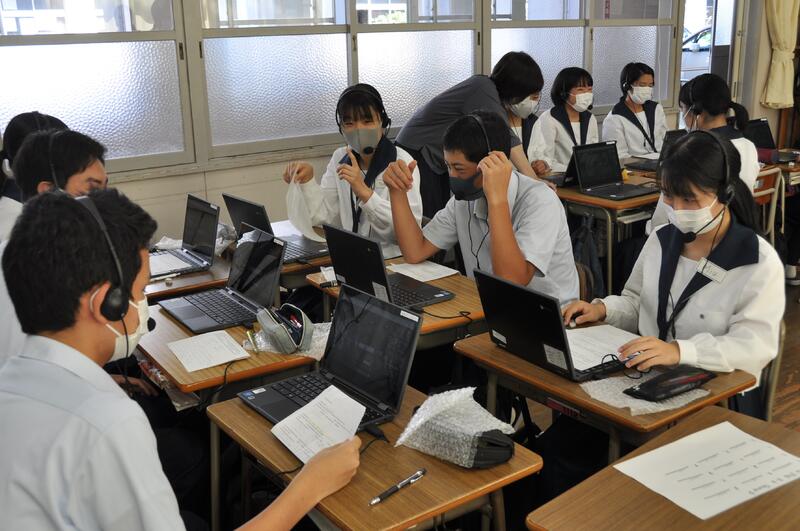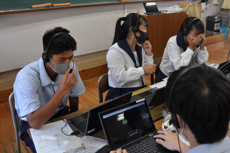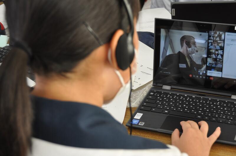 10月4日(月)3限目、4限目に本校1年生SSクラスと大津中学校3年生とでタブレットを用いた遠隔授業を行いました。