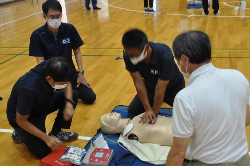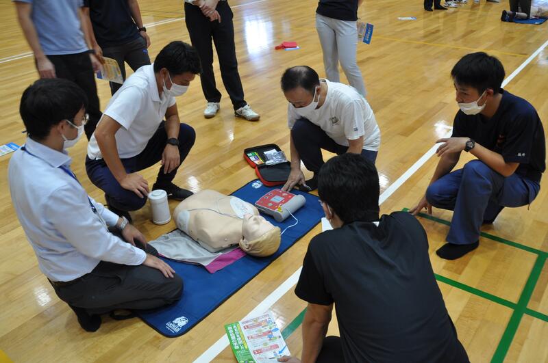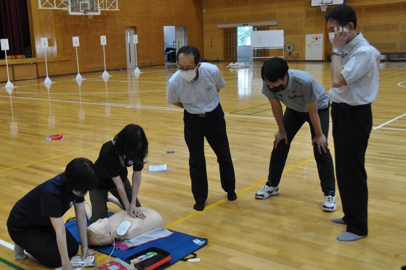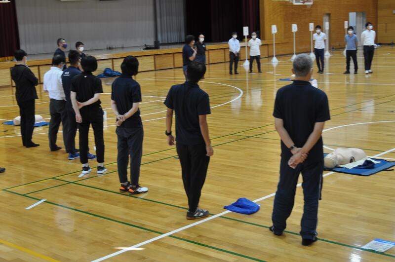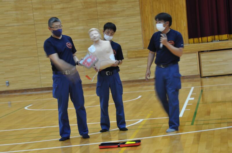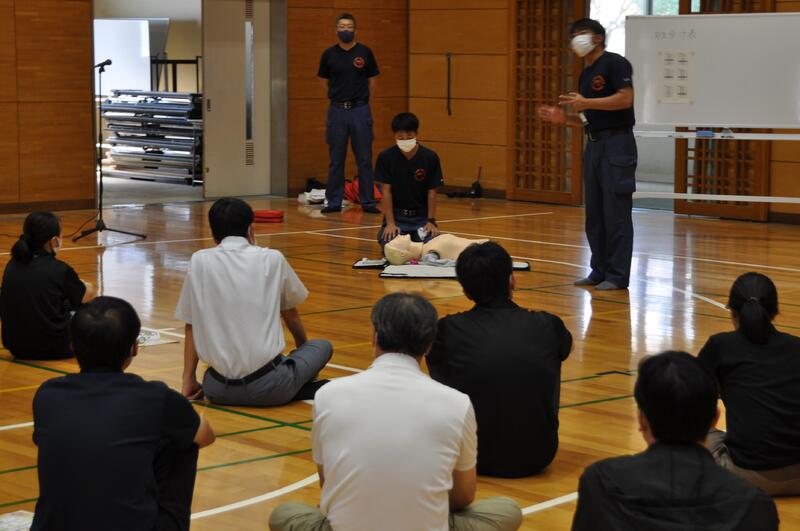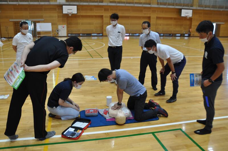 本日午後、菊池広域連合消防署から3名の隊員の方にご協力をいただき、職員研修(緊急蘇生法)を実施しました。6班編制で約90分、最後にはシミュレーショントレーニングを行いました。