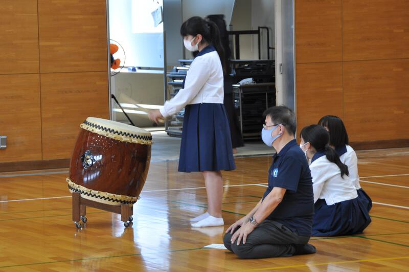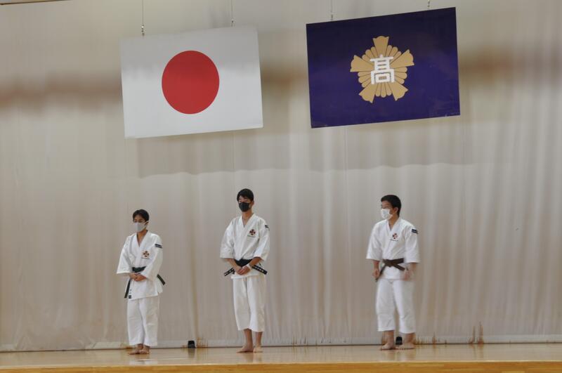 本日、10月14日(木)昼休み体育館ステージにおいて、少林寺拳法部・空手道部・剣道部 三部合同定期演武会が催されました。司会を放送部、太鼓を吹奏楽部に協力をしていただきました。