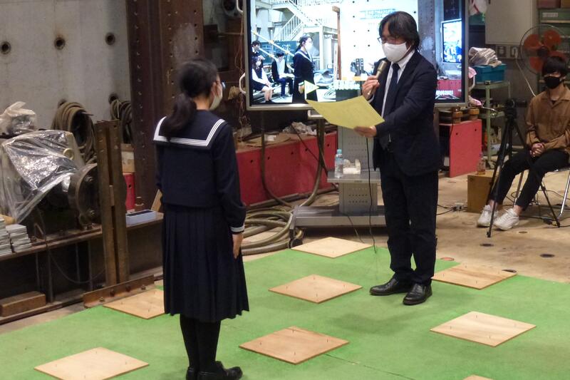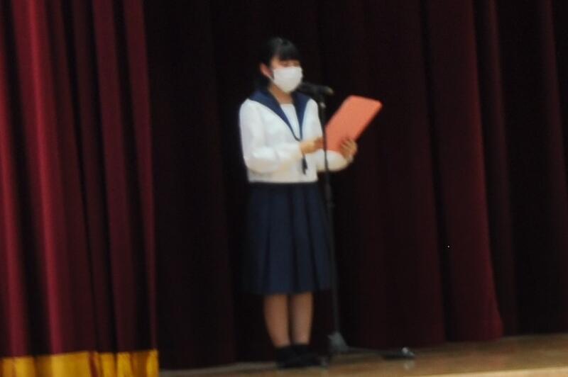 旧生徒会(3年生10人)に対しては、大嶋校長先生からお言葉をいただいた後、代表して会長の村上真信くんが1年間のお礼を述べました。コロナ禍で活動が制限され、例年とは異なる生徒会活動でしたが、募金活動やクラスマッチなど、できるところから取り組み、学校の活性化に貢献してくれました。お疲れ様でした。