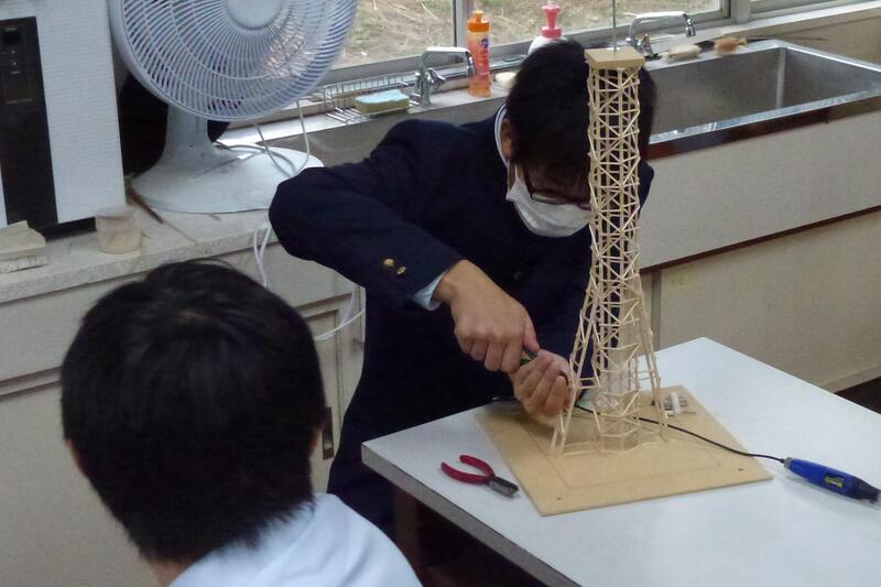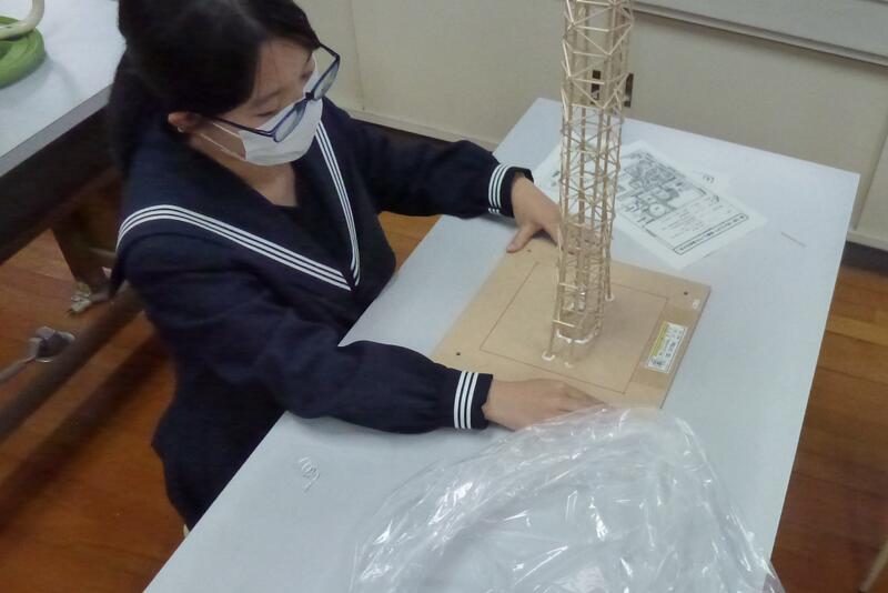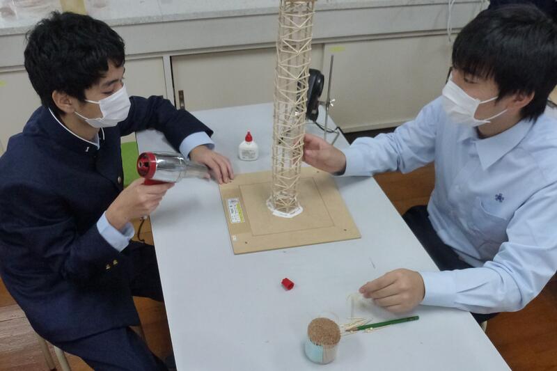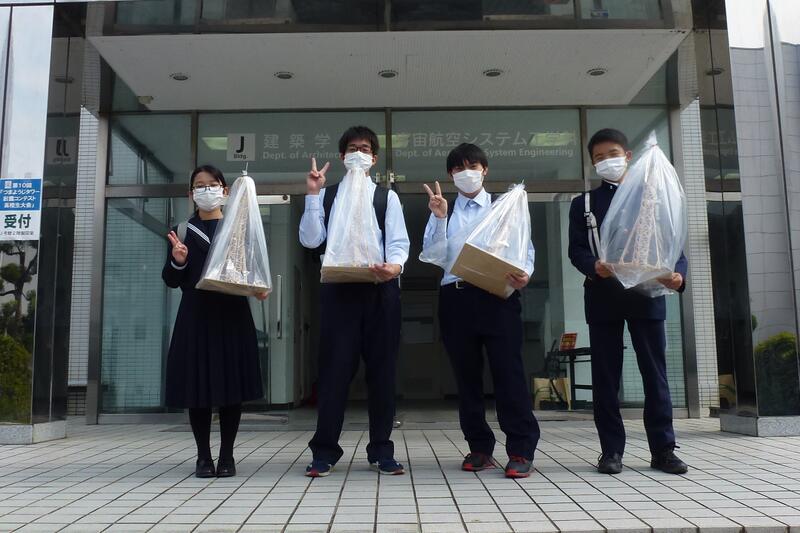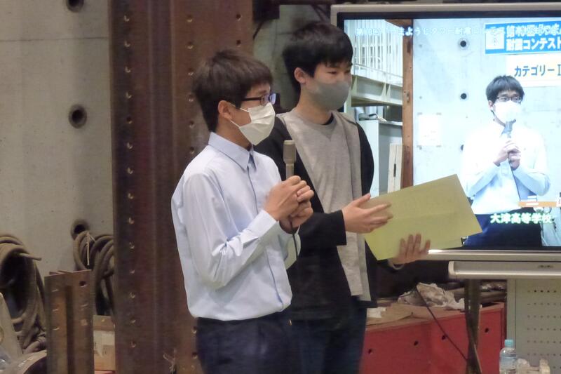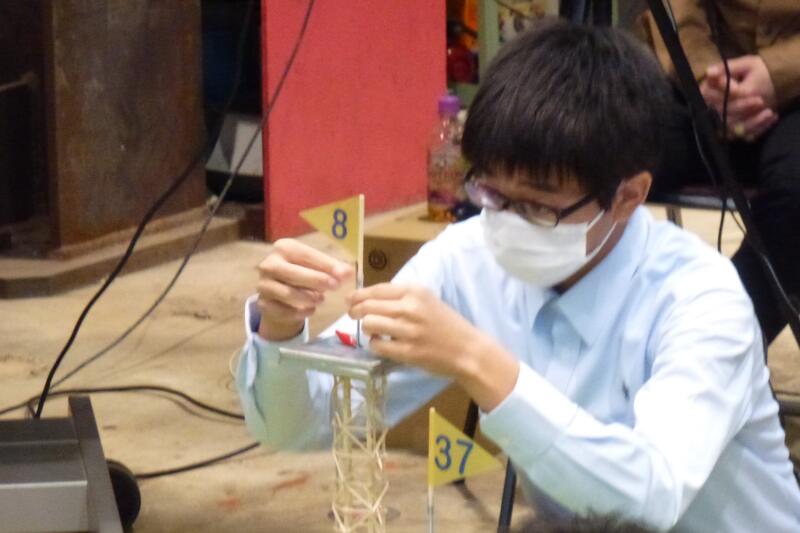 結果は井川・藤原(1年)が優勝、鳥丸・巻(1年)が準優勝、松岡・坂倉(1年)が3位と大津高校で上位独占でした。文化祭の準備などでどうにか完成した作品でしたが、10kgのおもりを乗せての揺れにも耐え、見事賞を勝ち取りました。