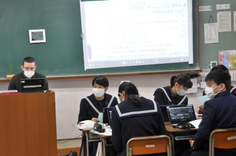 本日3限目、令和3年度ALT等を活用した小・中・高連携モデル校事業の取組で、大津中学校3年4組の生徒と本校1年2組の生徒がオンラインによる交流授業を行いました。生徒同士による英語を使ったオンライン交流は県内でも初めての試みです。今回、中学生は、外国の方に大津町を知ってもらう為のパンフレット作りに取り組んでおり、大津町の食・場所・人・行事などの紹介を英語で発表してくれました。高校生は中学生の発表を聞きながら、英単語を書き取り、質問や感想を英語で述べました。積極的に話しかけながら、笑顔で交流することができました。