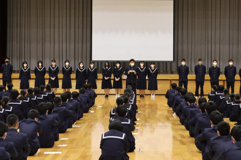 4月9日(金)生徒会企画による1年生との対面式と部活動紹介が行われました。今年度は、生徒会のメンバーと保健委員、放送部員が在校生代表として参加しました。生徒会長の村上くんからの歓迎の挨拶に対し、1年1組の坂倉くんが新入生代表で挨拶をしました。その後、生徒会企画の伝言ゲームや保健部員による「掃除の仕方」についてのプレゼンテーション、放送部作成による部活動紹介の動画(約50分)が流されました。