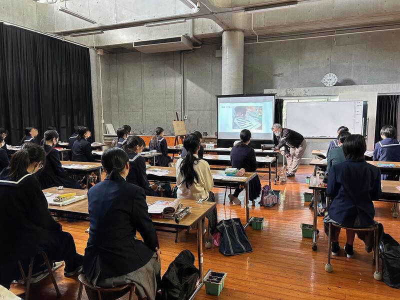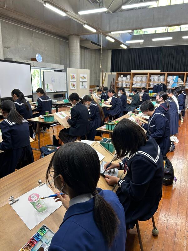 美術コースの特徴を紹介したり、令和7年度までの入試再現作品の公開やモチーフの説明などを行いました。今回は第2回ということで講習内容は「着彩」を主に行いました。専門的な内容でしたが、中学生の皆さんもしっかりとついてきてくれました。令和8年度の美術コースの入試では水彩画(静物)が実技検査として行われます。