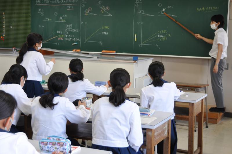 本日1限目、1年1組の理数物理の授業で本校初任者の渡邉先生の研究授業がありました。済々黌高校のスーパーティーチャーの上野先生においでいただき助言をいただきました。