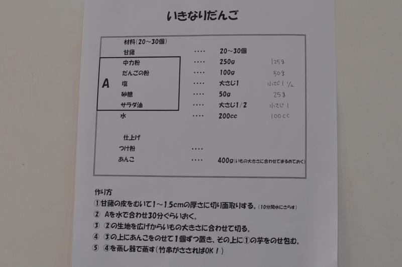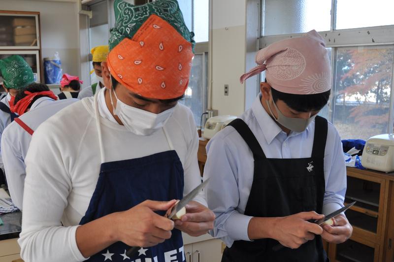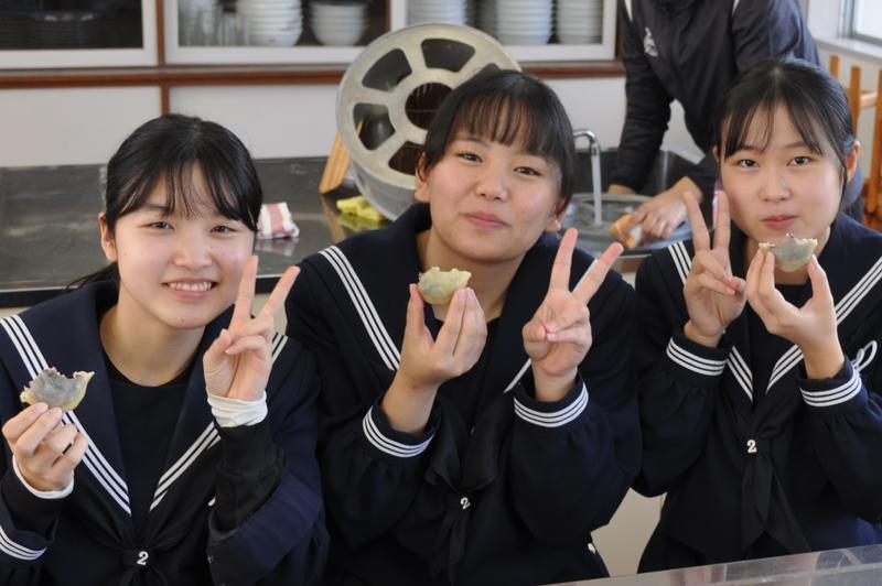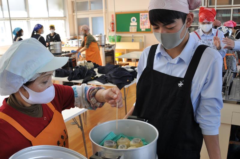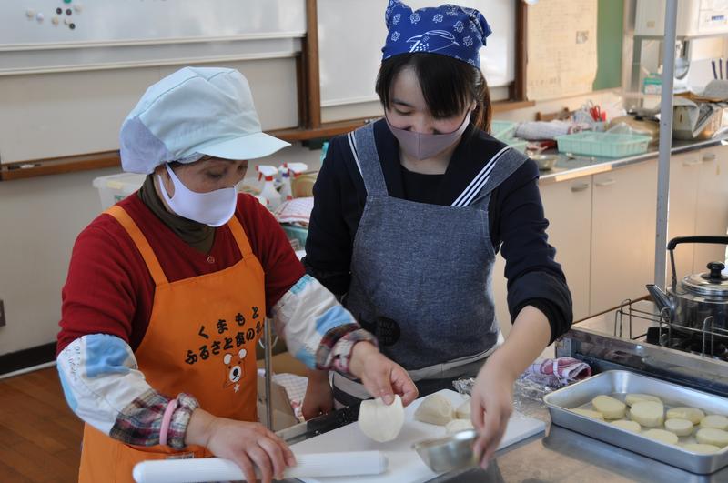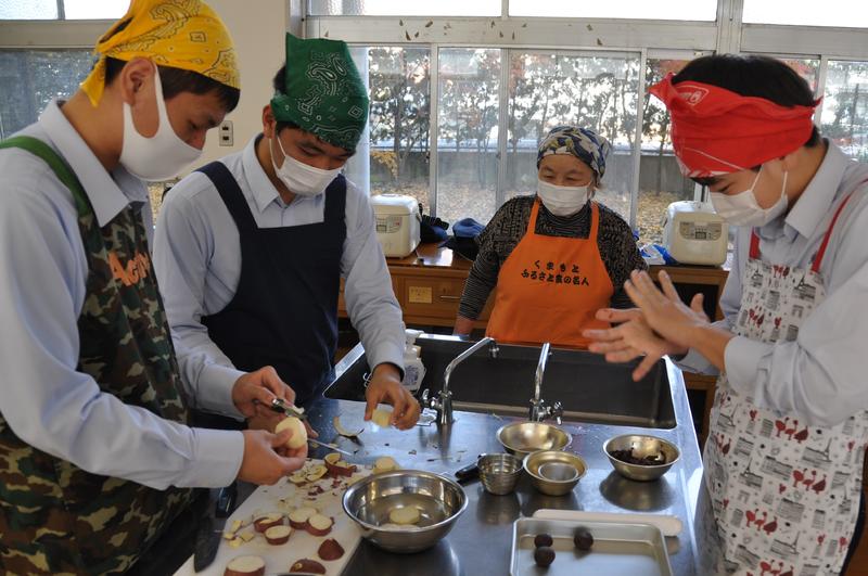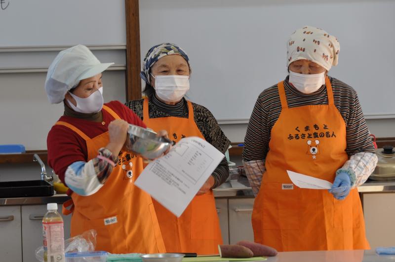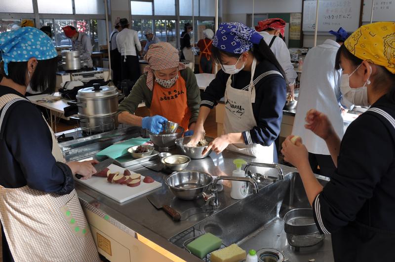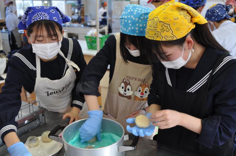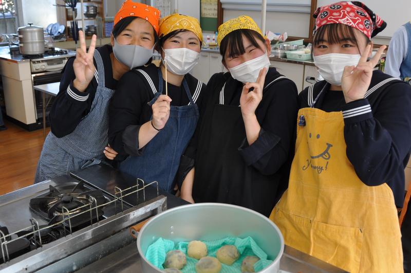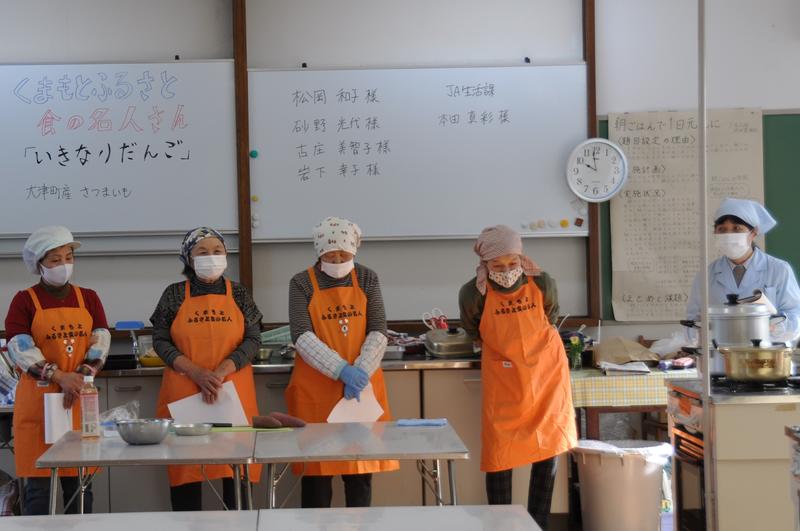本日、2年生6,7組の家庭科の授業で、大津町特産のさつまいもを使った「いきなり団子」を作りました。熊本県農林水産部農村振興局村づくり課の後援、JA菊池大津中央支所の協力を頂き、菊池地域「くまもとふるさと食の名人」の4名に来ていただき、ご指導いただきました。
