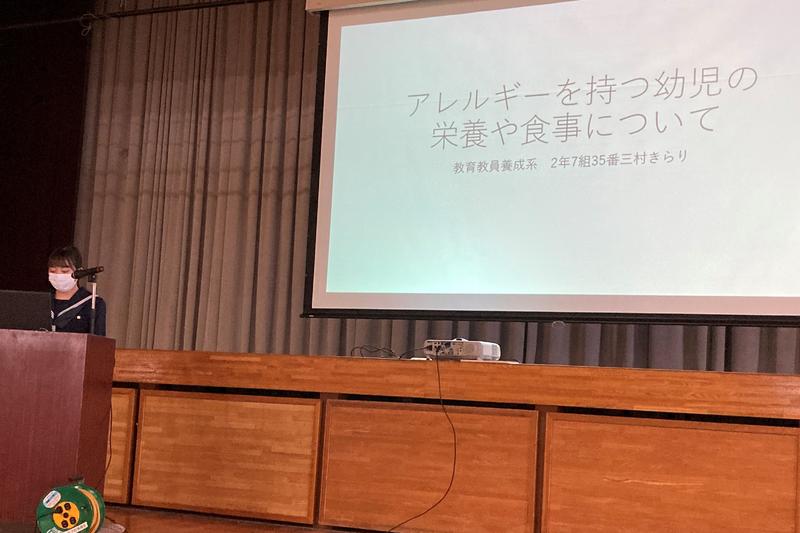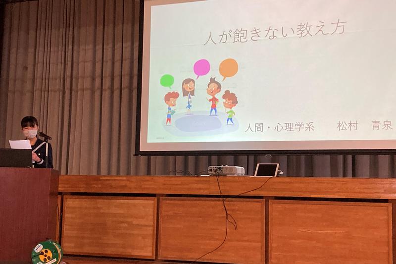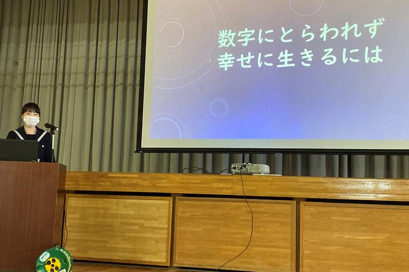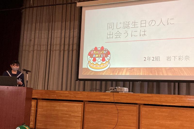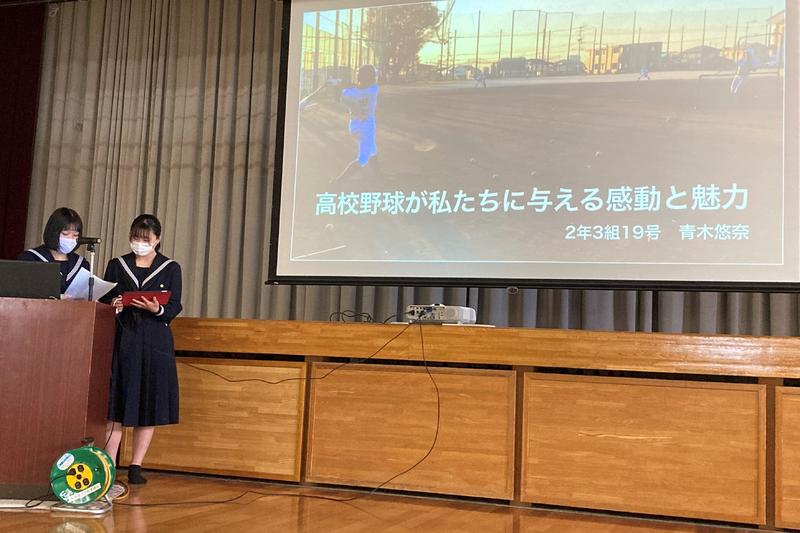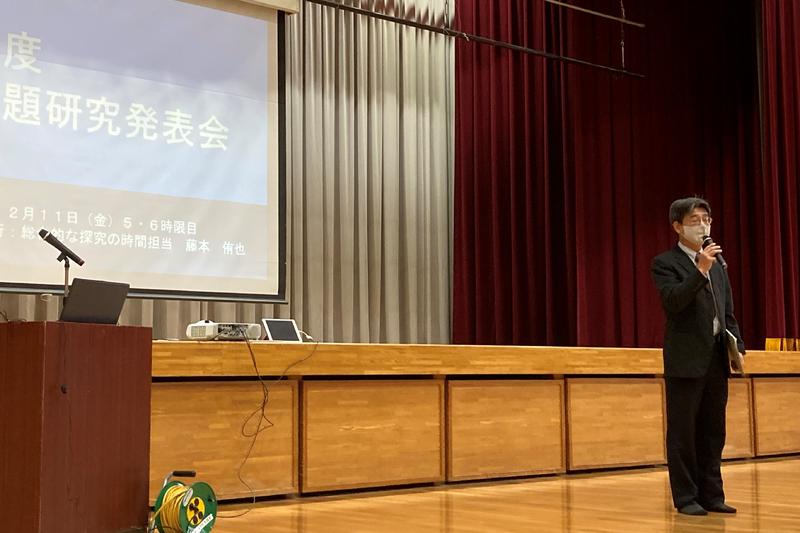 2年生では、2学期間、「総合的な探究の時間」において全生徒が9つのゼミに分かれ、個人研究に取り組んでいました。本日は、各ゼミで優秀論文に選ばれた研究の発表を行い、発表者全員を「優秀研究賞」として表彰しました。さらに、先生方から審査員を選出し審議した結果、5組水上さんの研究テーマ「数字にこだわらず幸せに生きるには」を「最優秀研究賞」に選出しました。