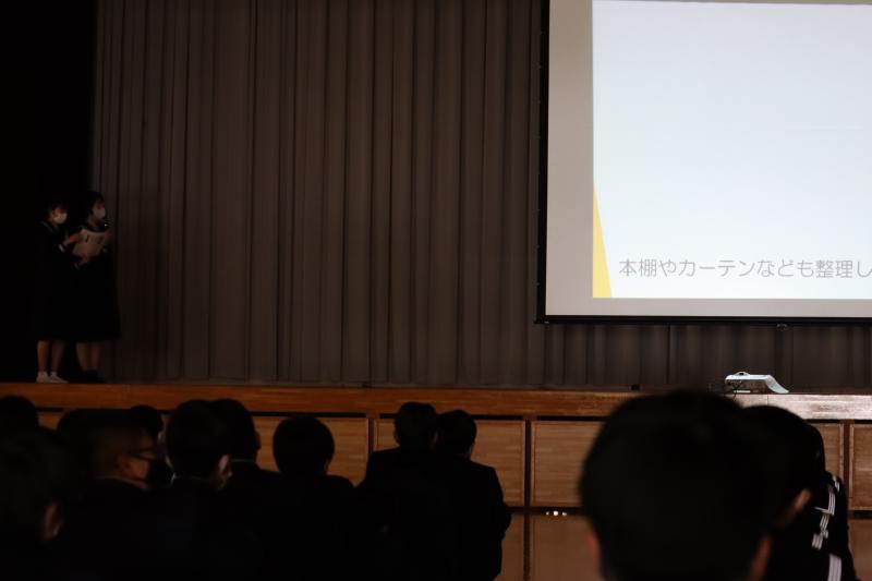 4月9日(金)生徒会企画による1年生との対面式と部活動紹介が行われました。今年度は、生徒会のメンバーと保健委員、放送部員が在校生代表として参加しました。生徒会長の村上くんからの歓迎の挨拶に対し、1年1組の坂倉くんが新入生代表で挨拶をしました。その後、生徒会企画の伝言ゲームや保健部員による「掃除の仕方」についてのプレゼンテーション、放送部作成による部活動紹介の動画(約50分)が流されました。