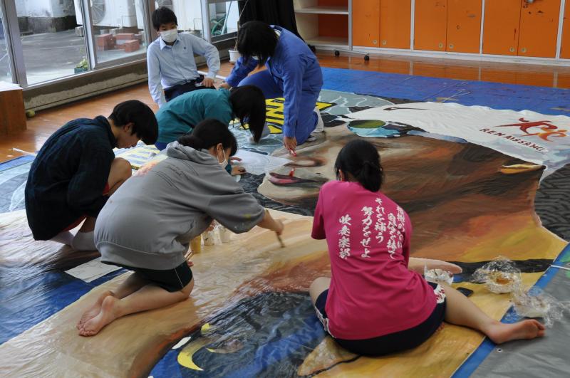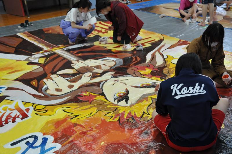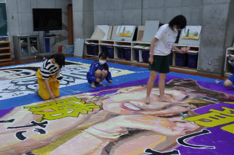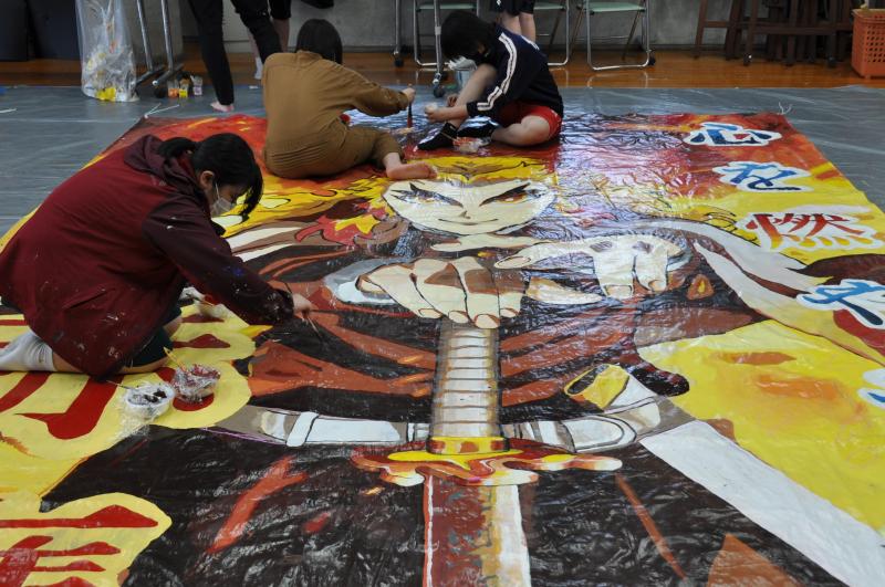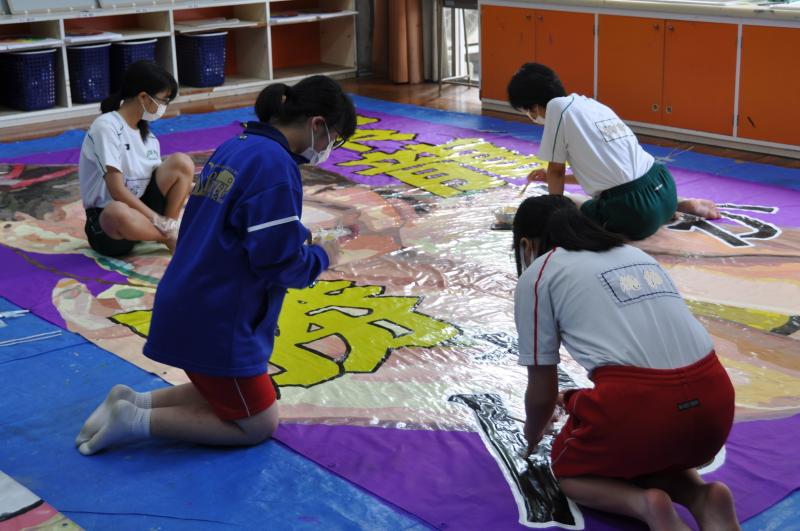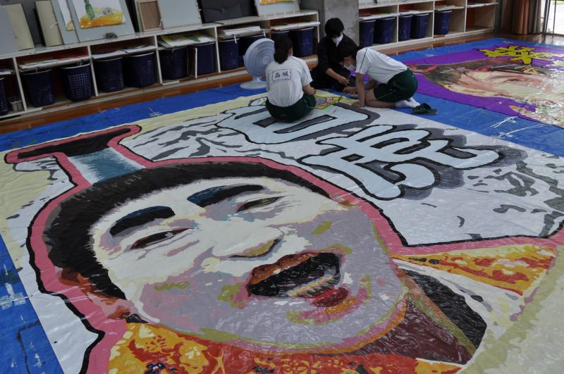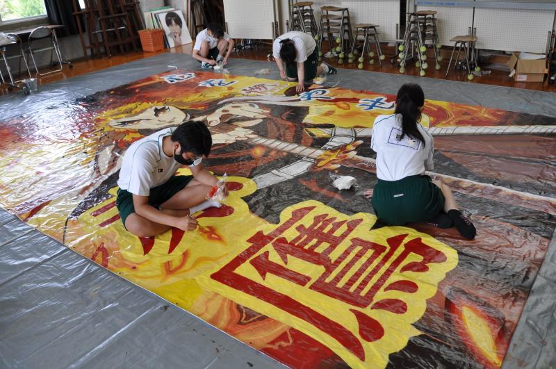 今日は体育大会の成功に向けて、早くから活動をしている美術コースと生徒会の様子を紹介します。美術コースの生徒は、体育大会の4つの団画の作成を行っています。生徒会のメンバーは、体育大会の各種競技で使用する小物の作成を行っています。