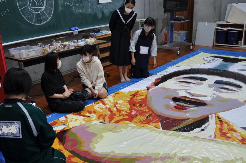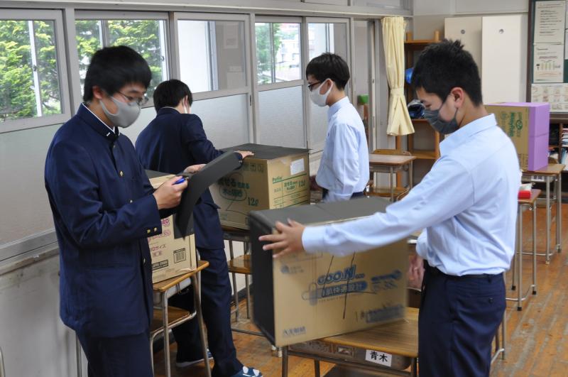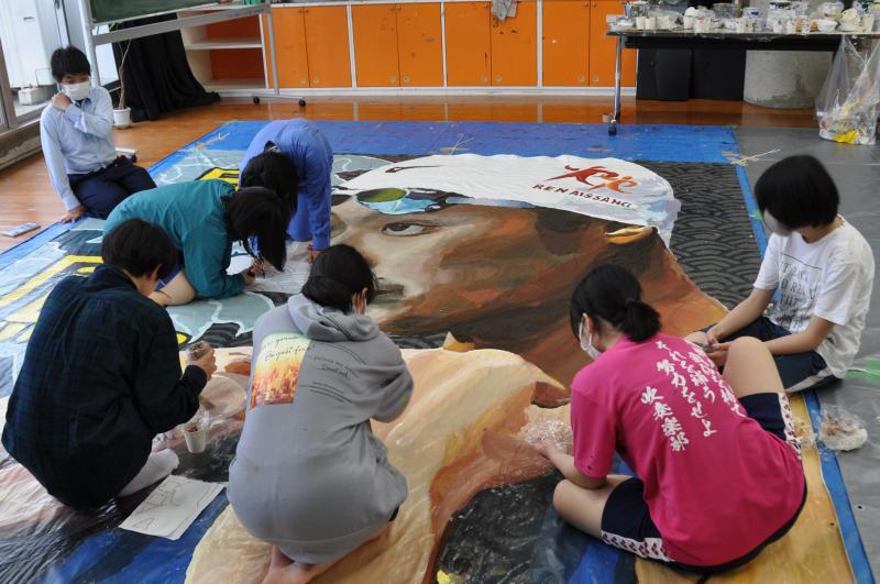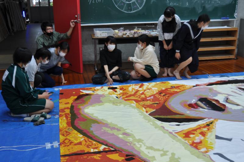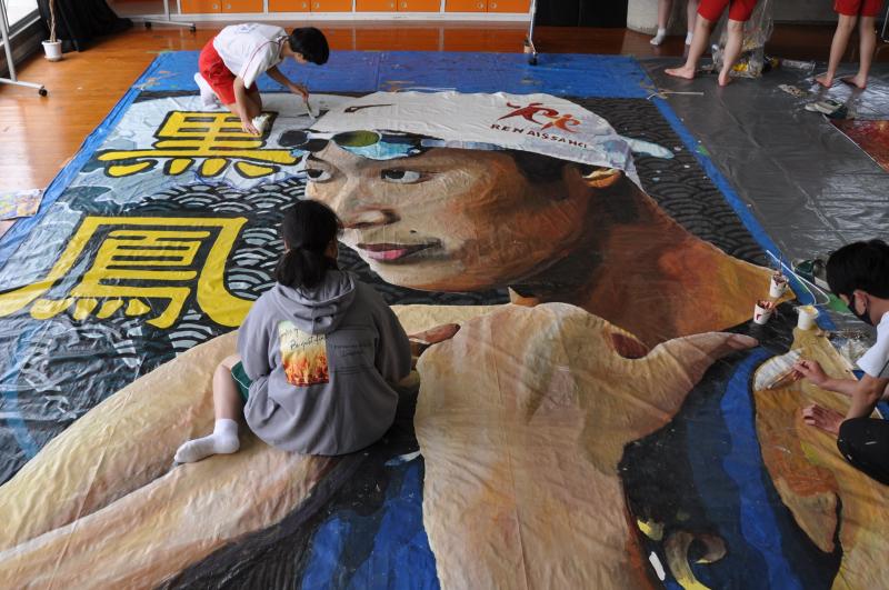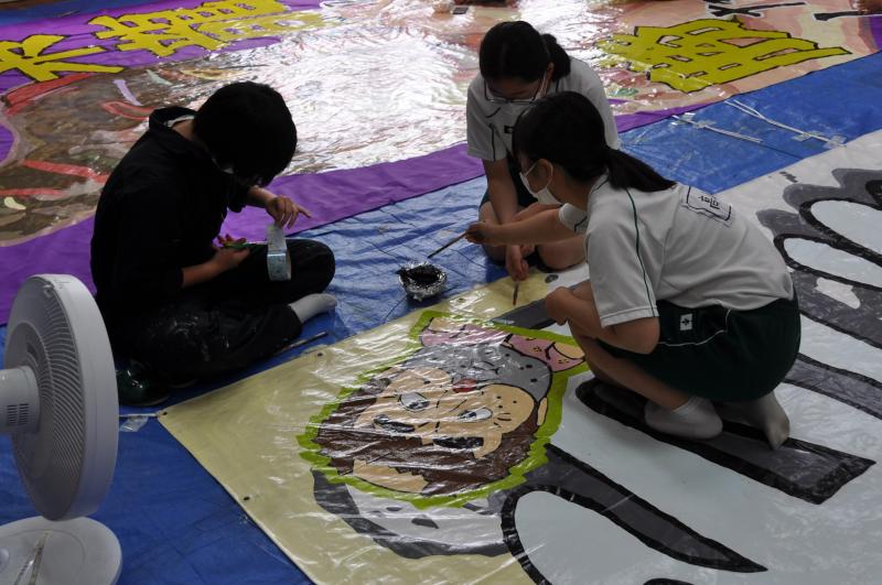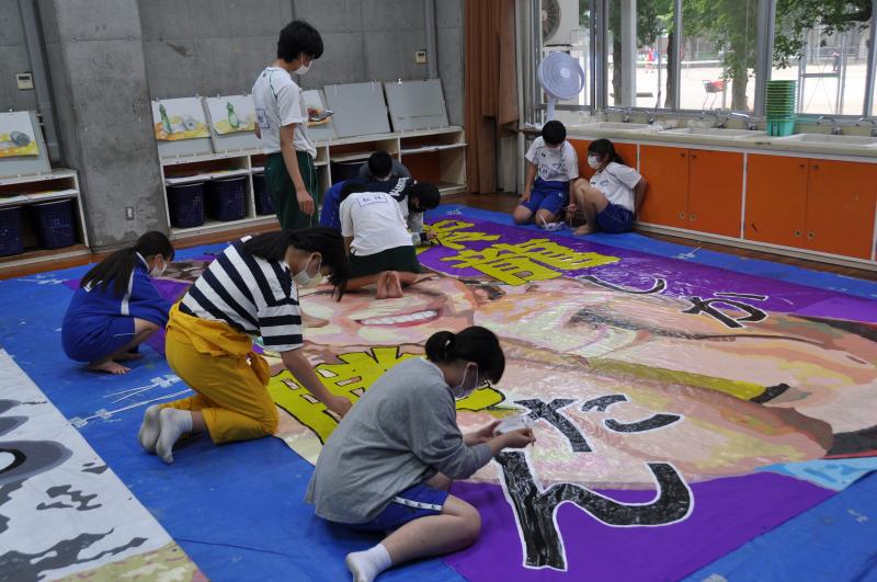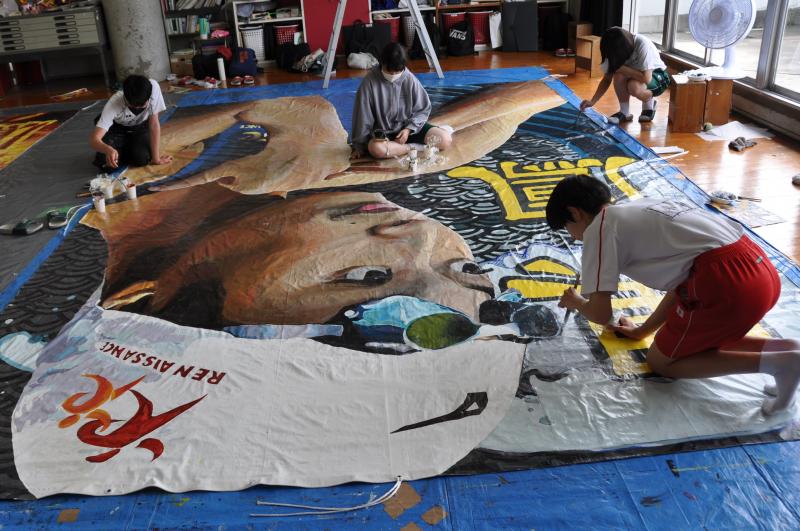 今日は体育大会の成功に向けて、早くから活動をしている美術コースと生徒会の様子を紹介します。美術コースの生徒は、体育大会の4つの団画の作成を行っています。生徒会のメンバーは、体育大会の各種競技で使用する小物の作成を行っています。