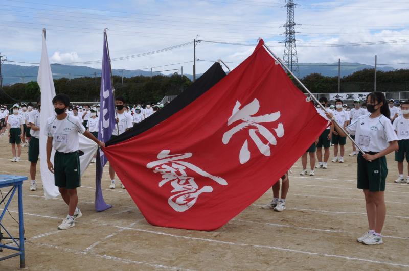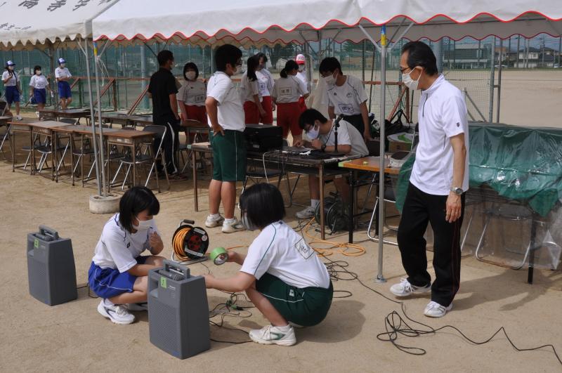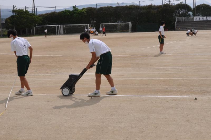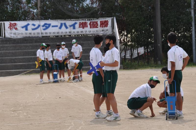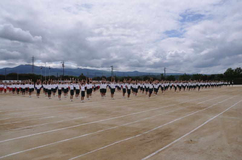 体育大会の会場設営が終了後、午前中は各団のエール交換と大高体操の練習を行いました。明日の天候が心配ですので、本日の午後から部活動紹介、高校総体・総文祭選手激励と1,2年生の競技の「タイヤそりレース」と「玉入れ」を行います。