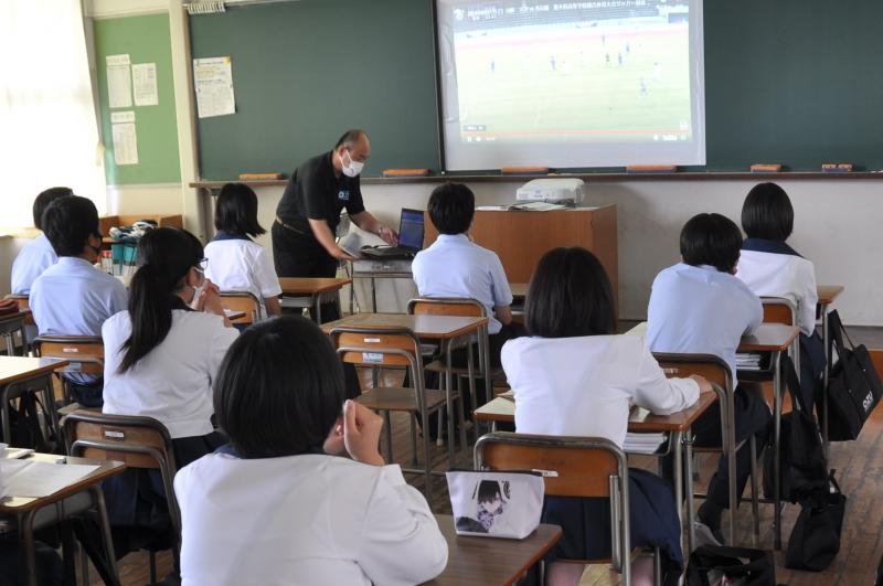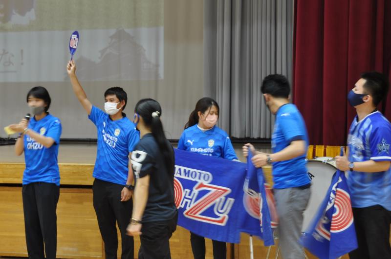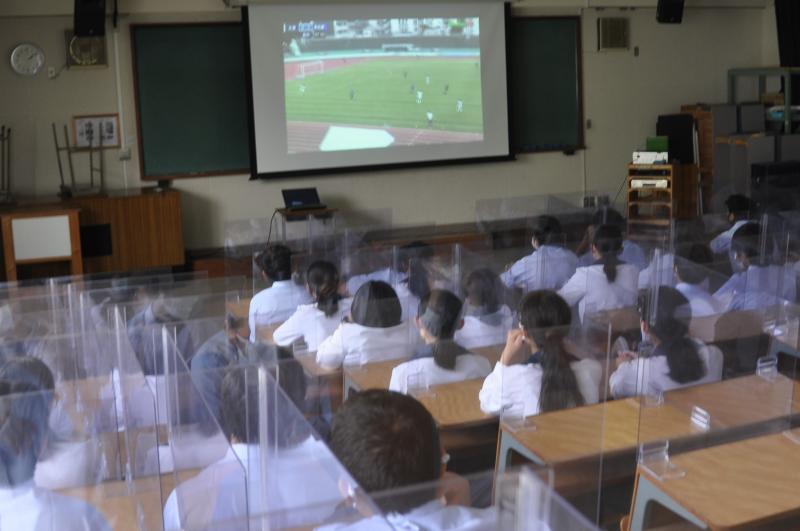 本日、水前寺競技場で第49回熊本県高校総体サッカー男子決勝戦が無観客で開催されました。例年、スタンドでの全校応援を行いますが、今年は2,3年生を体育館、1年生を視聴覚室や教室等に分けLIVE配信での応援を行いました。体育館では、3年サッカー部の岩下君の実況のもと、拍手での応援が起こりました。結果は、4対0で秀岳館高校に勝利することができました。