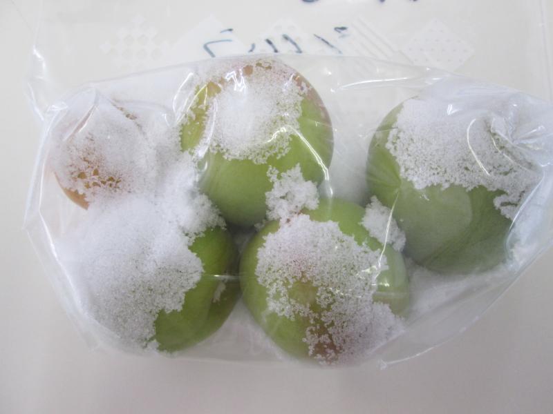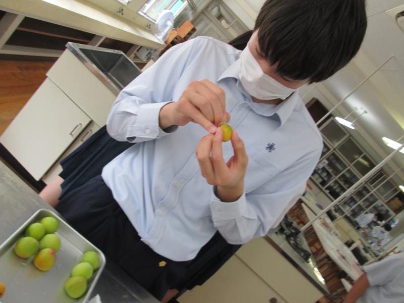 先週ちぎった梅が思ったよりも少なく、市販の梅を加えて梅の塩漬けを各自で作ることにしました。生徒たちからは「梅の堅さが1つ1つ違う」「いつもおばあちゃんのところから梅をもらうのですが、その時点で、へたもとられて、梅が漬けられている状態で来ます。自分で作ってみて、以外と梅は繊細な材料だとわかりました。」「梅の重量の20%の塩を入れることに驚いた。香りも良くて完成が楽しみだ」「家でもしてみたい」などの感想が挙がりました。