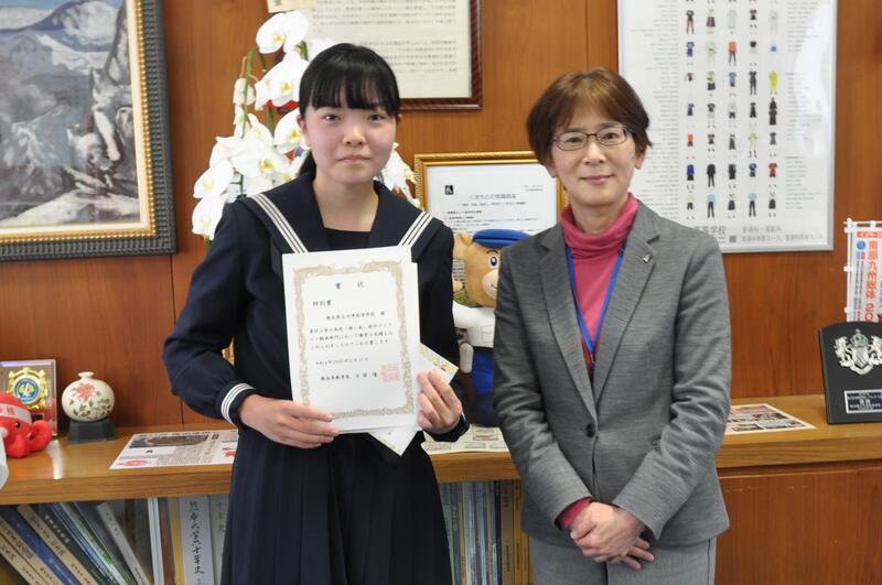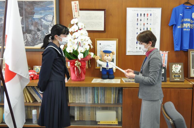 県立高校生が、高校生ならでは視点で、自分たちの通う高校の魅力を紹介する作品(動画・漫画・ポスター)の募集があり、本校から数点の応募がありました。動画部門作品名「Persistence pays off」で応募した3年松林さんが特別賞を受賞しました。本日、熊本県高校教育課高校魅力推進室から松村室長が来校され、松林さんに賞状と副賞を渡されました。