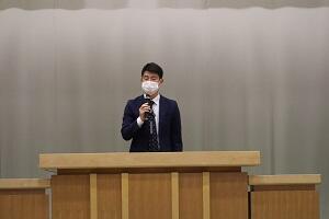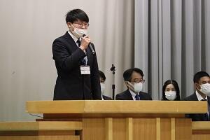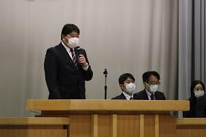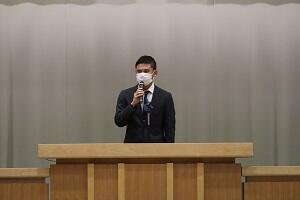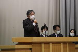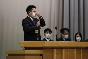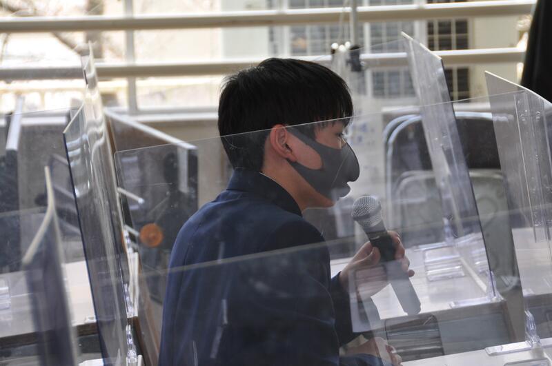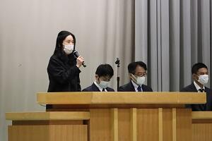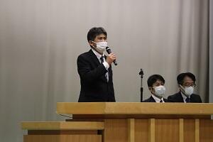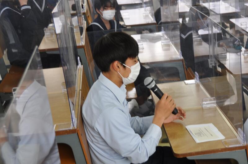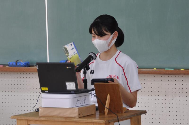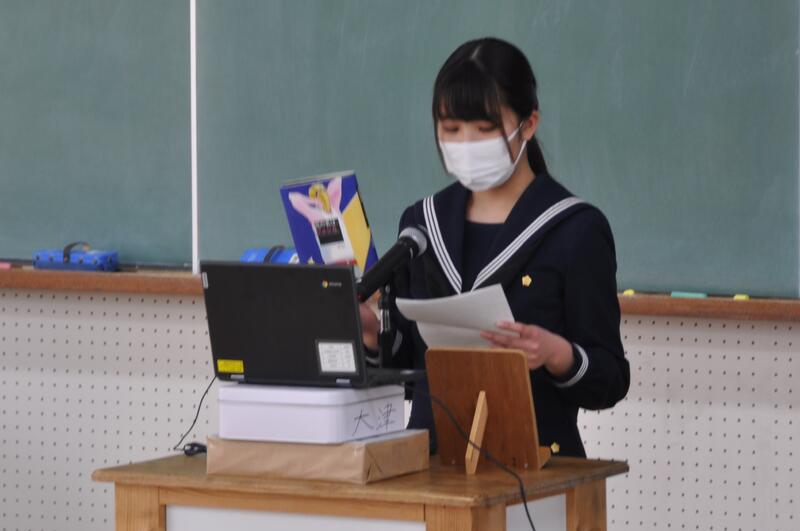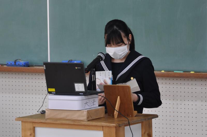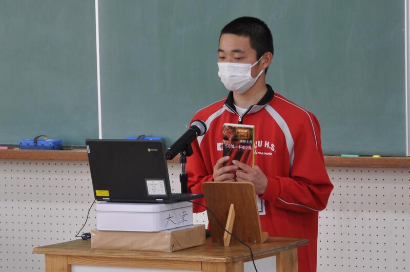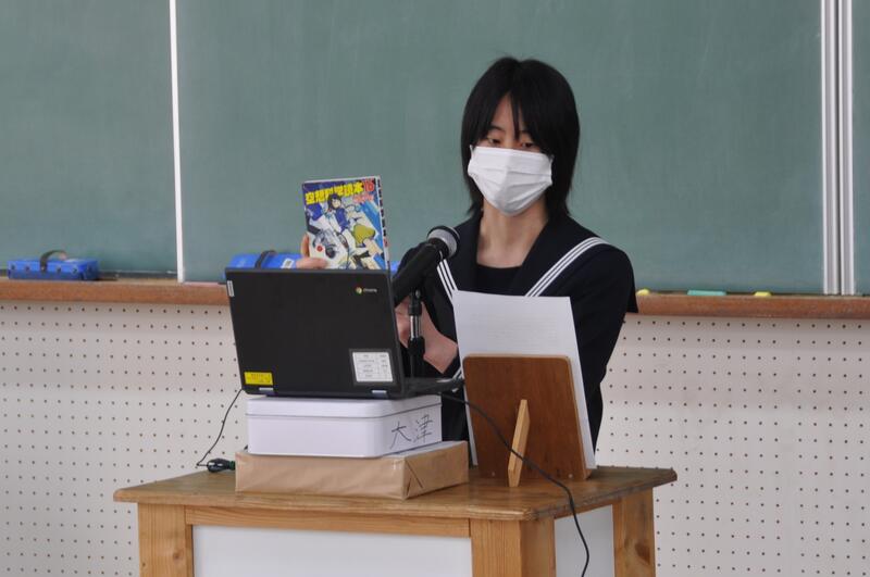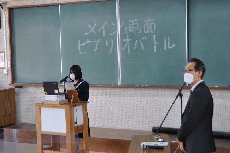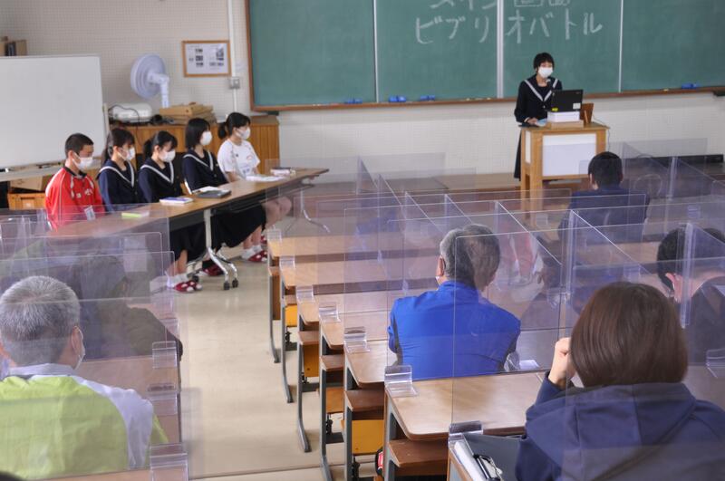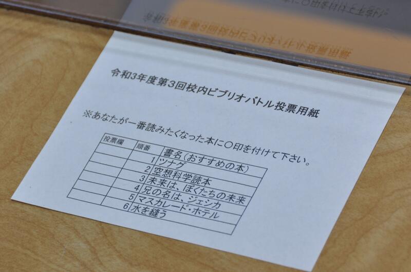 本日、クラスマッチ終了後、ライブ配信による校内ビブリオバトルが開催されました。バトルの模様を教室で観戦した全校生徒は、電子投票により「チャンプ本」を選出。優勝は東野圭吾作『マスカレード・ホテル』を紹介した2年2組の柏倉一晴君でした。会場の視聴覚教室には、ビブリオバトル県大会で優勝し全国大会に出場した卒業生も来場し、本の魅力に迫る質問を投げかけてくれました。本日紹介された6冊の本は、図書館の特設コーナーに展示され、希望する生徒に貸し出されます。