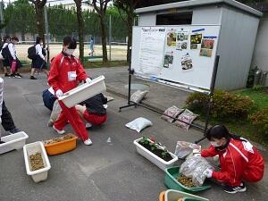 5月20日(金)放課後、ボランティアを募り、プランターへ花苗の移植と花壇の整備を行いました。曇り空の絶好の園芸日和!花植えのポイントや花の名前を学習しながら、手際よく作業をしていました。