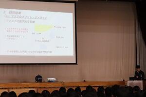 この探究発表会は、総合的な探究の時間で行ってきた探究活動の成果報告を行うものです。運営は、すべて生徒たちで行いました。発表は、1年理数探究の代表1班、1年総合的な探究の代表1人、2年理数科代表1班、2年生の総合的な探究ゼミの代表生徒10人の合計13テーマです。それぞれのゼミで予選会を勝ち上がってきた生徒たちなので、発表する姿も堂々としたものでした。今回、ステージ発表を行った生徒たちは、3月4日(土)に行われる第1回熊本スーパーハイスクール全体発表会~県立高校学びの祭典~に出場予定です!