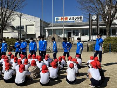 2月16日(木)午後、本校サッカー部(体育コース1,2年生)と小学校5年生(約120名)との交流事業が大津小学校で開催されました。夏休みに、本校生が小学生の夏休みの宿題を支援した「学習ボランティア」がきっかけとなり、今回の交流会を持つことになりました。