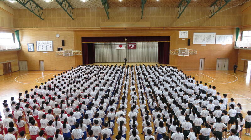 防災講話に続き、全学年での全体練習が始まりました。あいにくの雨のため体育館でのスタートでしたが、各団長を中心に整列隊形や場所の確認を行いました。