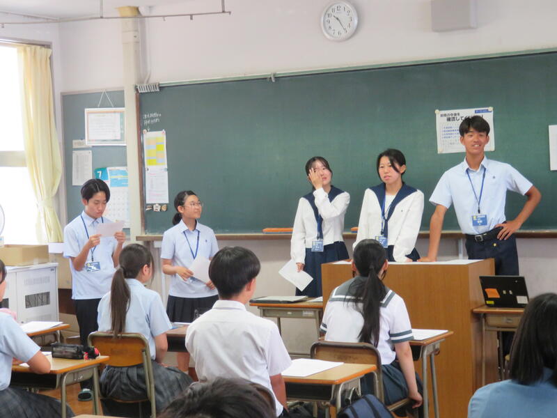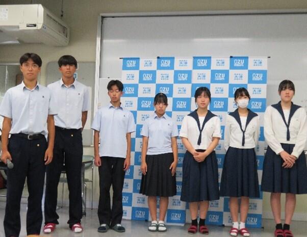 その後、生徒会より動画による「大高生の1日」の紹介、生徒の目線での学校紹介、質疑応答などが行われました。中学生からの「大津高校に通ってよかったと思うことは何ですか」「学校行事で一番楽しいのは何ですか」などの質問に対して、生徒会の生徒が率直に答えていました。