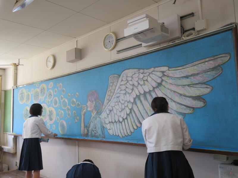 始めに、各教室をリモートで繋ぎ、校長先生の挨拶で開会。特別企画として、美術コースによる黒板アートライブ制作の様子を配信しました。