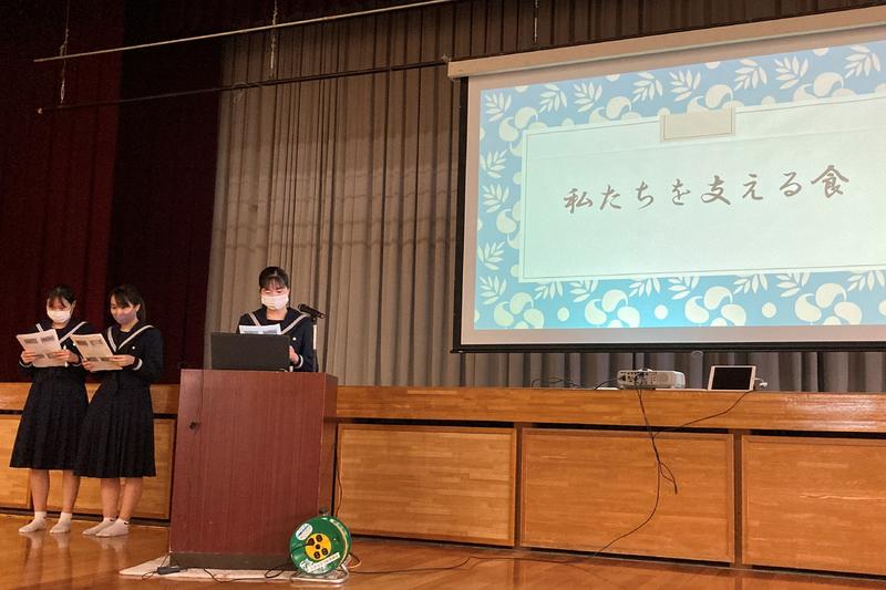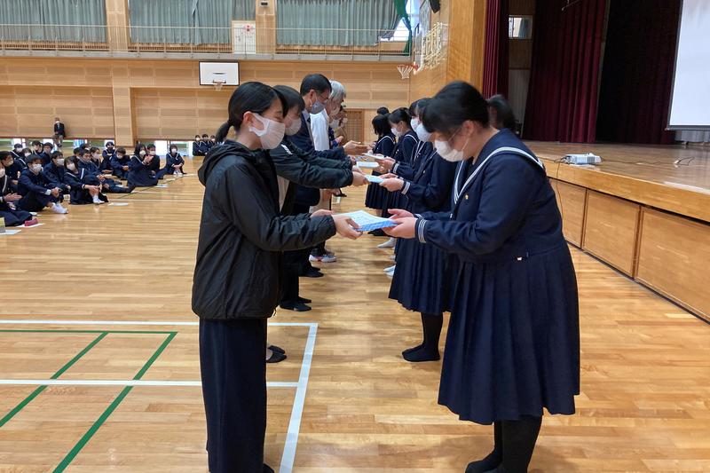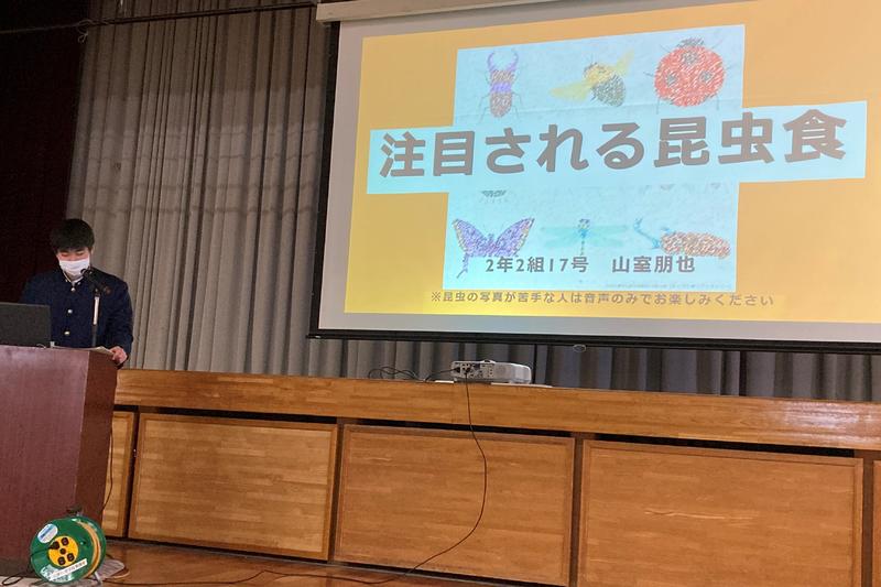 2年生では、2学期間、「総合的な探究の時間」において全生徒が9つのゼミに分かれ、個人研究に取り組んでいました。本日は、各ゼミで優秀論文に選ばれた研究の発表を行い、発表者全員を「優秀研究賞」として表彰しました。さらに、先生方から審査員を選出し審議した結果、5組水上さんの研究テーマ「数字にこだわらず幸せに生きるには」を「最優秀研究賞」に選出しました。