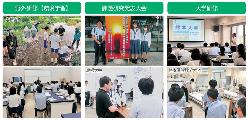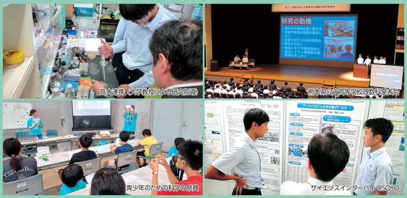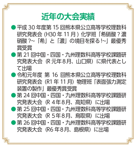 理数科では、理数探究の時間があり、班別に課題を設定して調査や実験を行い、研究する力を育成しています。また大学や研究機関等との連携事業を実施し、生徒に専門的な科学技術に触れる機会を与え、知的好奇心を引き出し、自ら学ぶ姿勢を育みます。そのために、今後も研修の内容をより深め、疑問に挑戦する力をつけていきます。