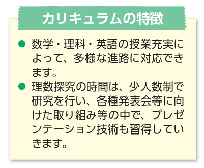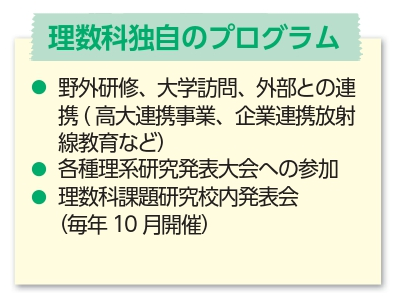 現在の社会は、あらゆるところで科学技術の恩恵を受けています。そしてそれらの技術は、論理的な思考力や科学的探究心の上に成り立っています。理数科では、数学で論理的な思考力を、理科で科学についての問題解決能力を養い、理数分野を中心とした各方面で活躍できる人材の育成を目指しています。