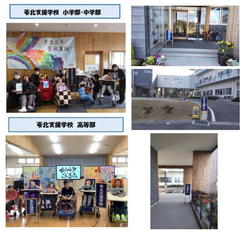 御寄付いただいた校内看板を玄関や敷地内に設置することで、来校者に本校校舎をわかりやすく案内し、敷地内の「一方通行」や「右折禁止」を知らせることができています。木製枠にアクリル板を使用した青地白文字の格好の良い看板は、令和4年度から共用を開始した新校舎のイメージをさらに良くしてくれました。