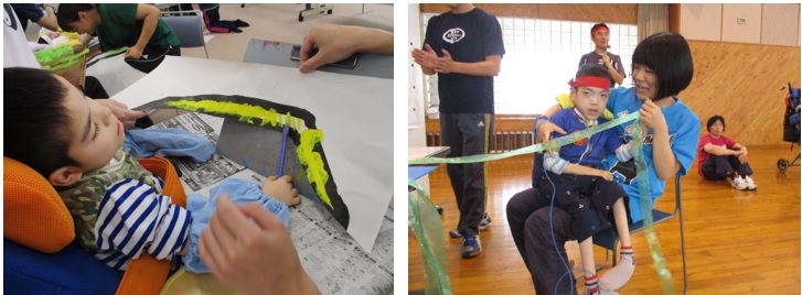 制作活動では、ひもを引っ張って紙を破ったり、絵の具で手形をとったりしました。制作中、絵の具のドロッとした感触に驚くなど、様々な表情が見られました。壁画「どんぐり村の秋まつり」が完成しました。