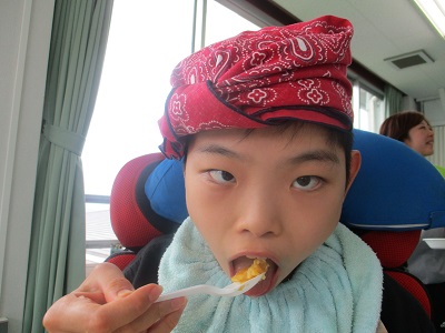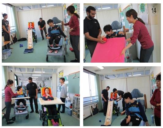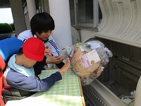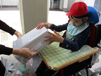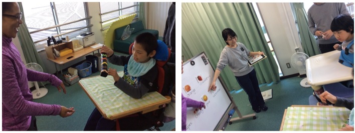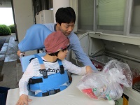 中学部の生徒2人は、日頃学校で行っている活動を生活の場であるはまゆう療育園の居室で行いました。はまゆう療育園の職員の方の前で、少し緊張していた様子でした。慣れてくると、いつも以上に張り切っていました。