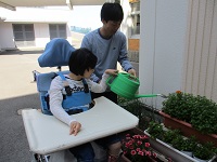 学級活動の授業で、「役割」や「働くこと」について学習しました。まず、先生たちがどういう仕事や係をしているか考えました。その後、ゴミ捨てや花の水かけ等を実際に見たり、体験したりしました。体験後にいつもその仕事を行っている係の先生から「ありがとう」と言われると、嬉しそうでした。授業後には自分から「窓ふきします!」と伝えてきた生徒もいました。