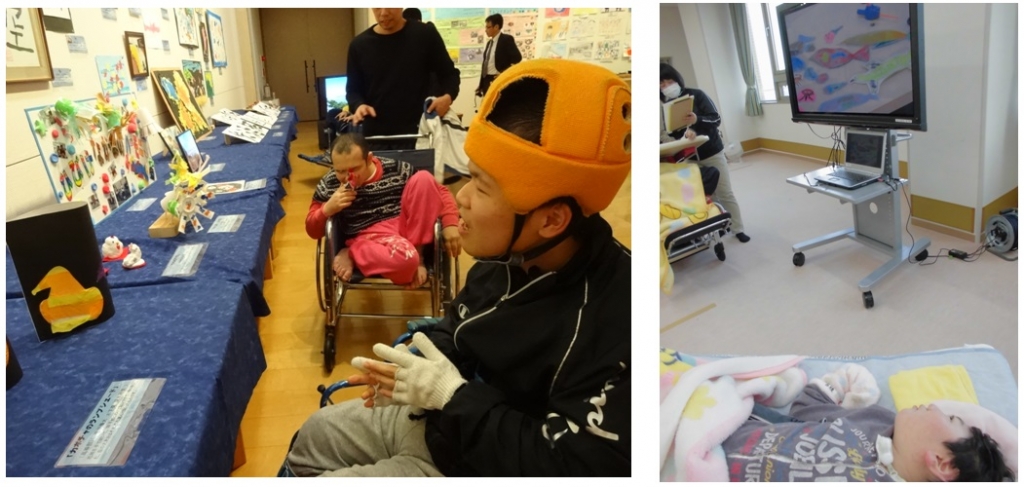 1月24日、学校の近くの如水館で開催されている天草支援学校・苓北支援学校合同作品展を見学に行きました。会場には、両校児童生徒の作品や、肢体不自由児デジタル写真展の入選作品がずらりと展示してありました。絵を通して見える自由な世界観や、得意なことを生かした味わい深いタッチの書など、見応えのある作品に興味津々でした。生徒たちは、自分や友達の作品を眺めたり、体験型の作品で遊んだりして充実した時間を過ごしました。見学に行けなかった生徒も、校内で大型テレビに映し出した写真や映像を楽しみました。当日の様子は、熊日新聞(1月25日付)で取り上げられました。