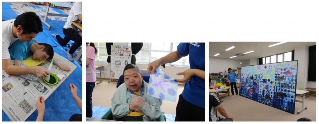高等部の生徒みんなで障子紙を染色し、組み合わせて海の中の景色を表現しました。生徒たちは、染めた後の紙の模様に興味があるようで、染め紙に注目しながら、時間いっぱい制作活動に取り組むことができました。できあがった染め紙は7月の学習活動で取った魚拓と組み合わせて板に貼り付け、大きな屏風を完成させることができました。屏風をよく見ていると、まるで海の中を魚が泳いでいるようです。