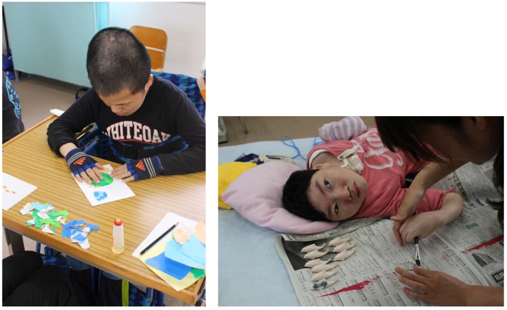 本校では11月26日(日)に創立40周年記念式典を行います。記念式典に向けて、記念品の焼き物の着色と、海の生き物をイメージした絵の制作を行いました。たくさんの素焼きの焼き物を割らないように気をつけながら、自分の得意な動きで色をつけていきました。また、紙をちぎったり絵の具を使ったりとそれぞれの方法で、海の生き物の絵を完成させることができました。生徒たちの作品で、お客様に喜んでもらえると嬉しいです。