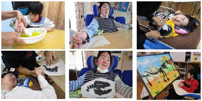 中学部は天草市御所浦白亜紀資料館主催の「恐竜絵画コンテスト」への応募に向けてみんなで協力して共同作品に取り組みました。最初にイメージを膨らますために恐竜の映像を見たり、過去の入賞作品を鑑賞したりして恐竜について学び、制作を開始しました。背景は和紙を染色して山・空・地面・草木を描き、恐竜はちぎって丸めた花紙を背景に貼って、頭・胴体・尾・足・腕と分けて制作しました。染色特有の淡い背景と恐竜の迫力ある化石に大満足の仕上がりになりました。